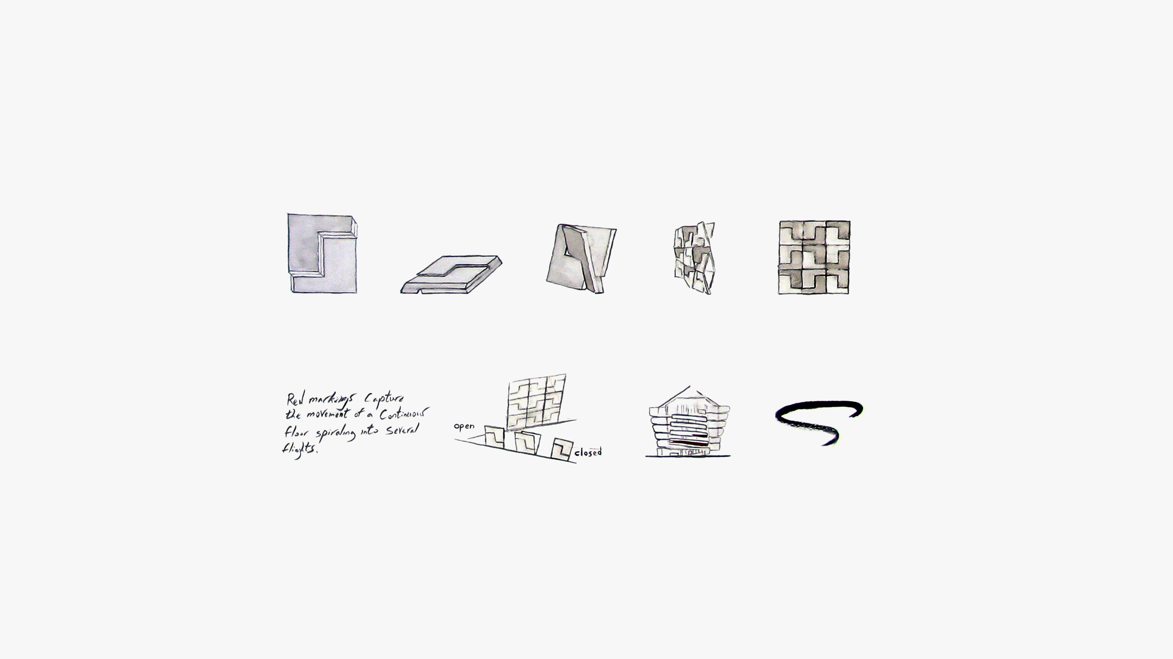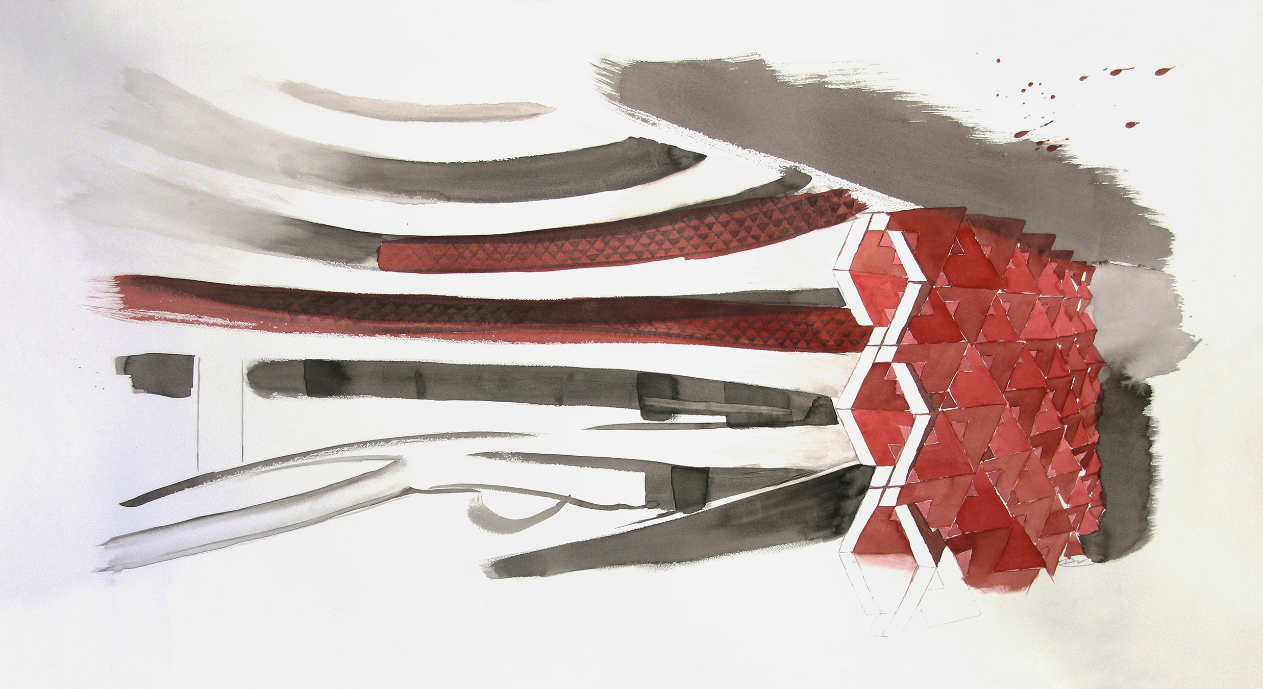 Dror was invited to participate in the Guggenheim’s exhibition, Contemplating the Void: Interventions in the Guggenheim Museum. The benefit exhibition serves as a finale to the museum’s 50th anniversary , featuring renderings of visionary projects in a salon-style installation. The wall represented in Dror’s watercolor is made of the QuaDror squares, which are designed in such a way that when they are placed on the floor in the open position, they form a rhombus. The beginning and end edges of the wall then create a true vertical as they climb up parallel to the slope of the floor. By creating this continuous wall spanning 410° in the middle of the spiraling floor, Dror conveys the uniquely unbroken feeling of the space by showing an additional beginning and end.