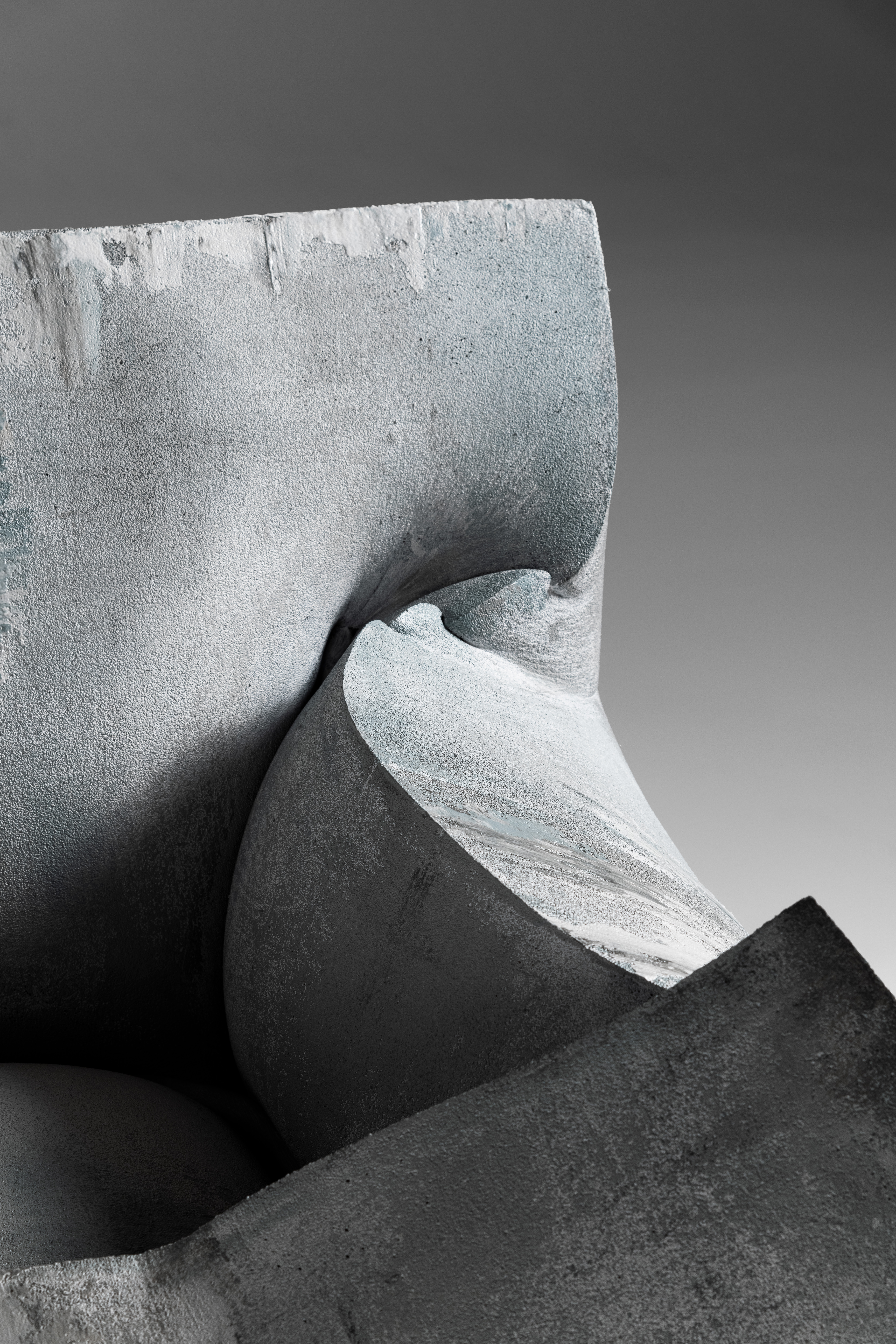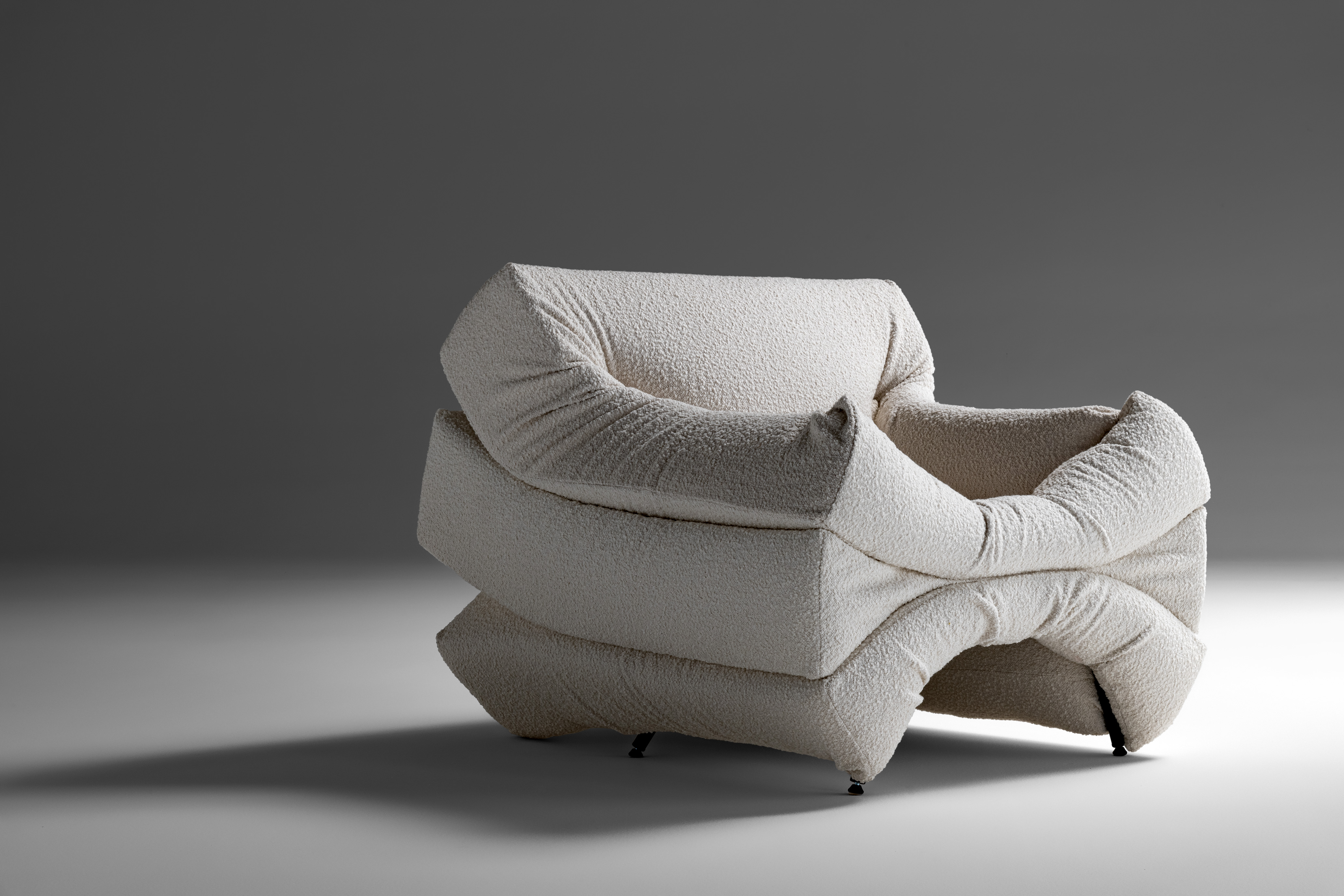 Made with three compressed layers inside a painted metal structure, the armchair is available in a single version as a real work of art dedicated to galleries and museums. The project is the result of a complex, totally manual surface treatment to make the foam paintable with oxidized liquid copper and/or concrete effect: a result with a remarkable visual impact that preserves its softness.