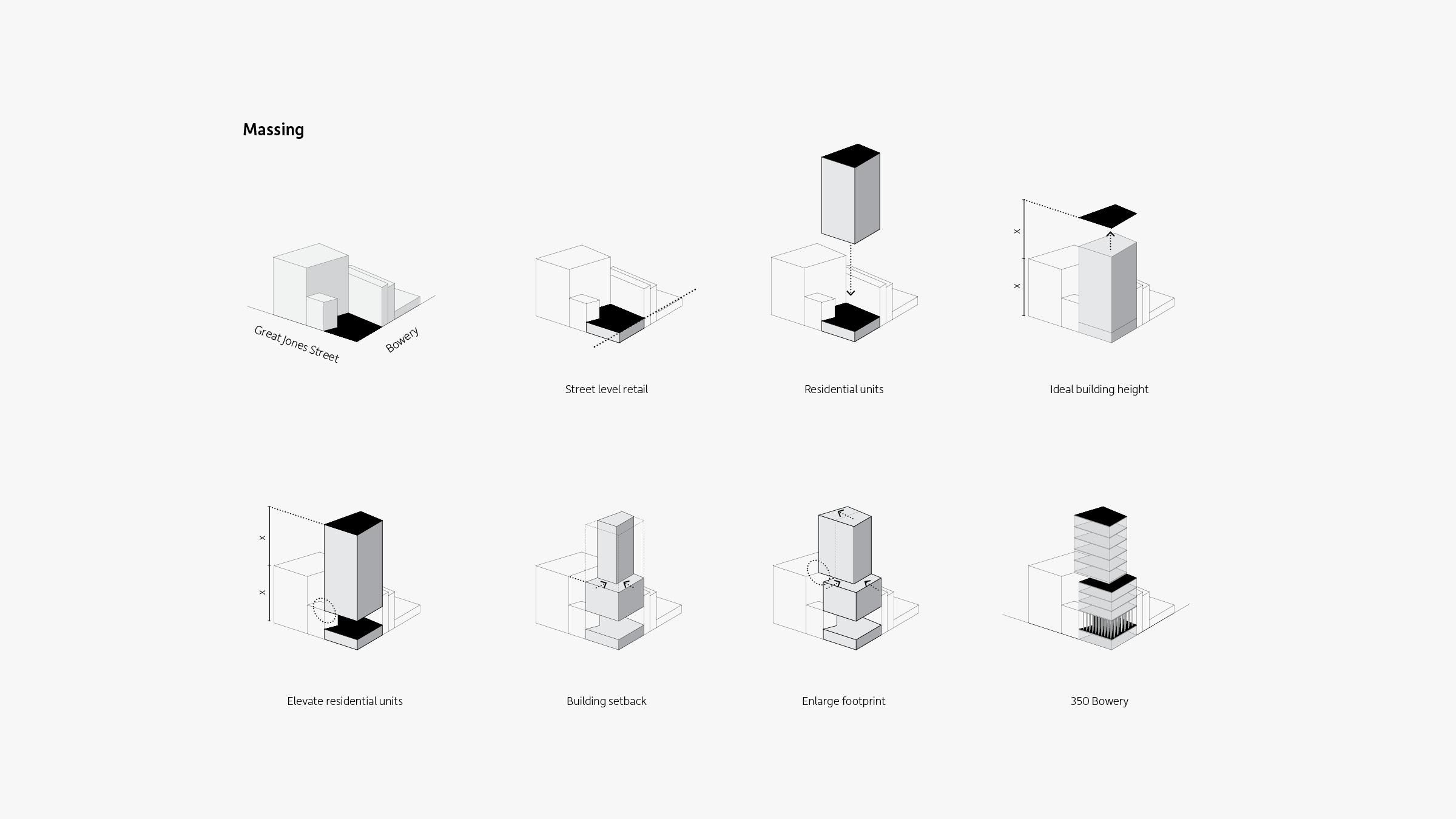 350 Bowery consists of three curiously stacked glass volumes, each thoughtfully sized to align with its neighbors: the base of the top and middle units follow horizontal planes formed by the roofs of adjacent buildings, kissing each structure’s northeast edge in a gesture of respect. A forest of columns elevates the residential units to achieve this connection, creating an outdoor sculpture garden that offers glimpses of the surrounding environment. Anchored by a retail space at street level, 350 Bowery is a new typology of building that lets the existing locale determine its distinctive shape.