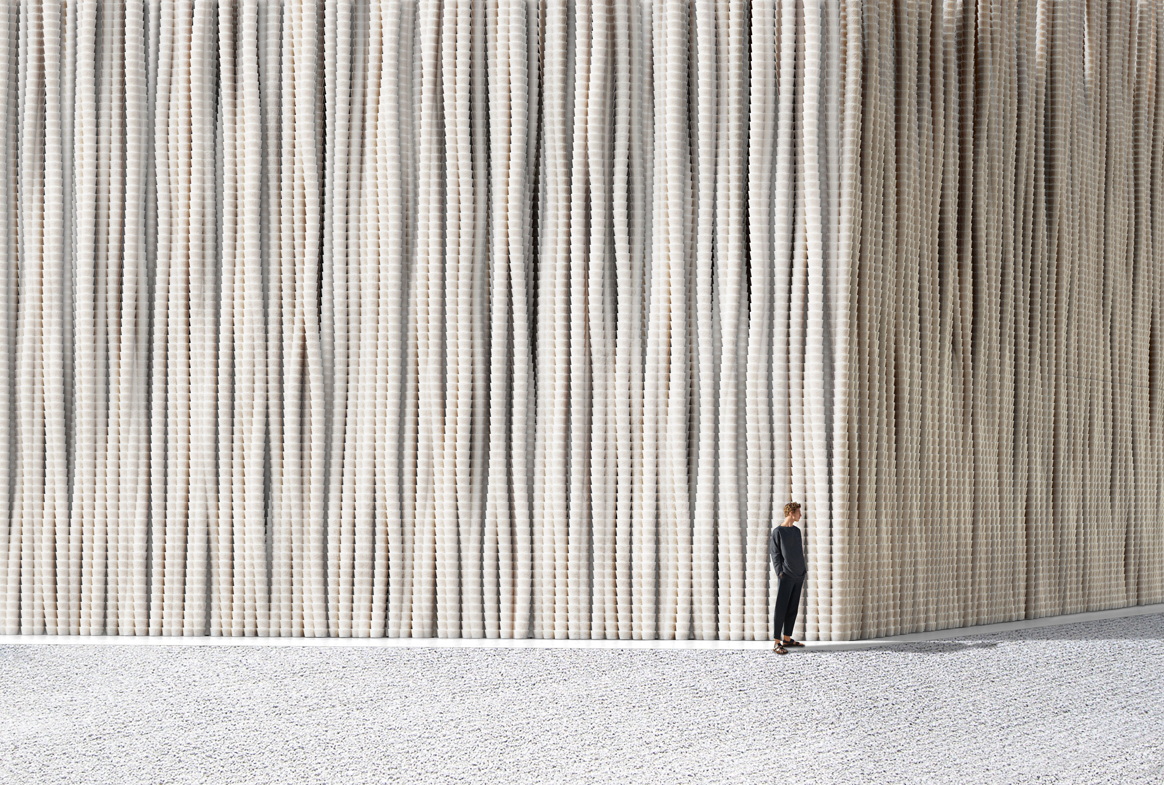 Our concept consists of a minimal white rectangle, which, like contemporary galleries, aims to take nothing away from the art inside. Surrounding the structure is a series of narrow shoots, each built of a slender tower of independently stacked fragments of bleached concrete. The shoots extend to various heights, evoking a fountain frozen in time. A thin slit of glass peeks through the top of the museum's boardwalk-facing side, providing sweeping views for a terrace or café.