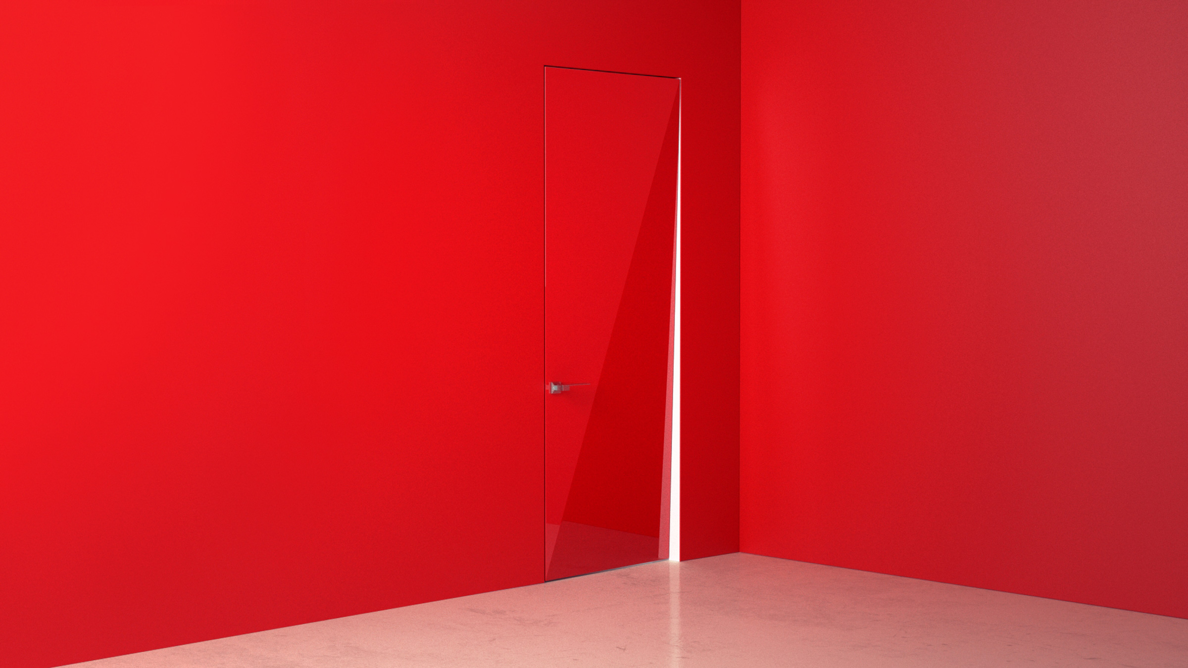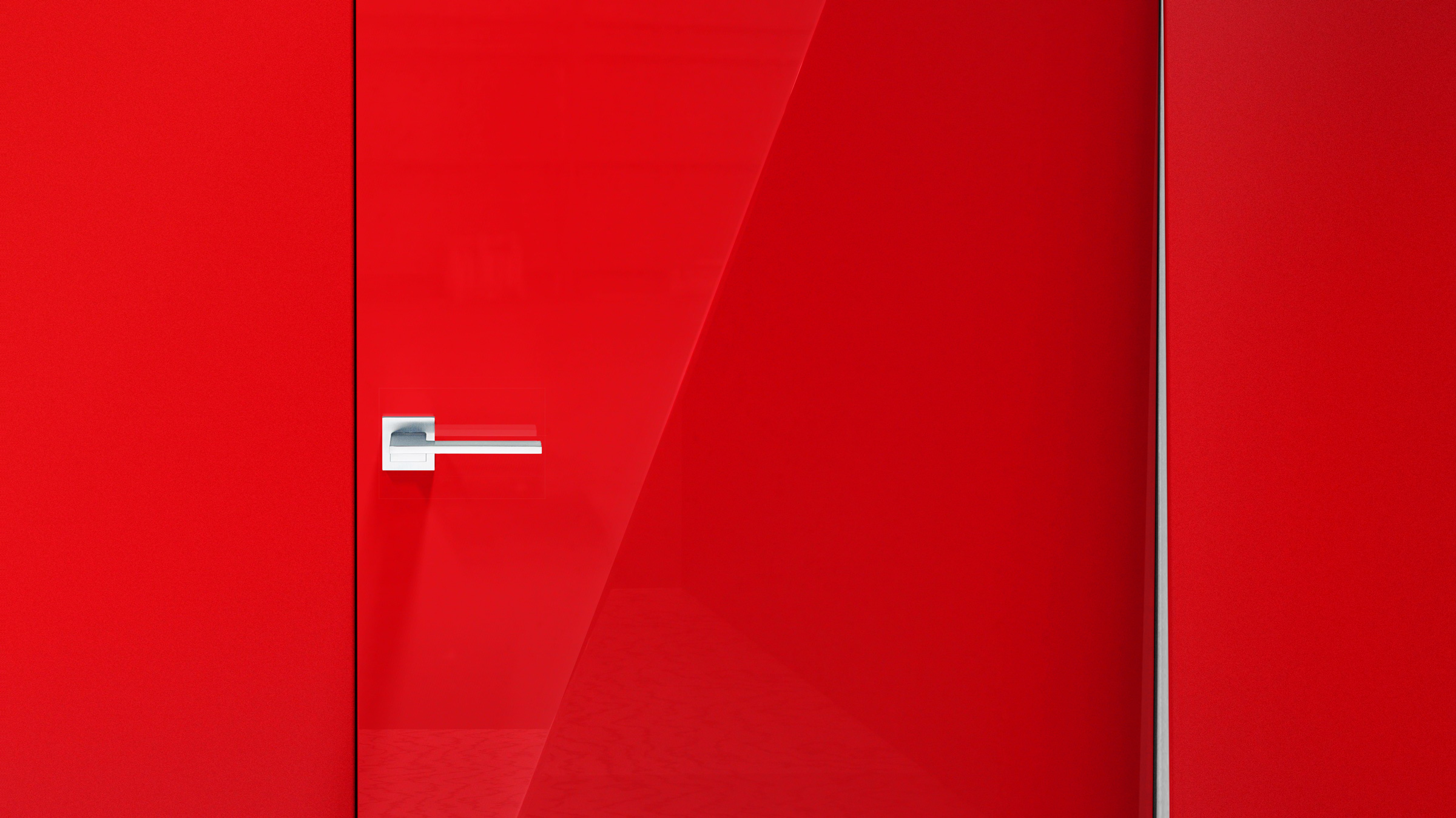 The single diagonal crease of the door is created by extending one of its four corners back to the opposite side of the door’s frame. This forms, in the most minimal way, a fracture of light that reflects on its lustrous high-gloss surface, and also alludes to the door’s inward swinging movement. The Davina door is available in red, black, or white.