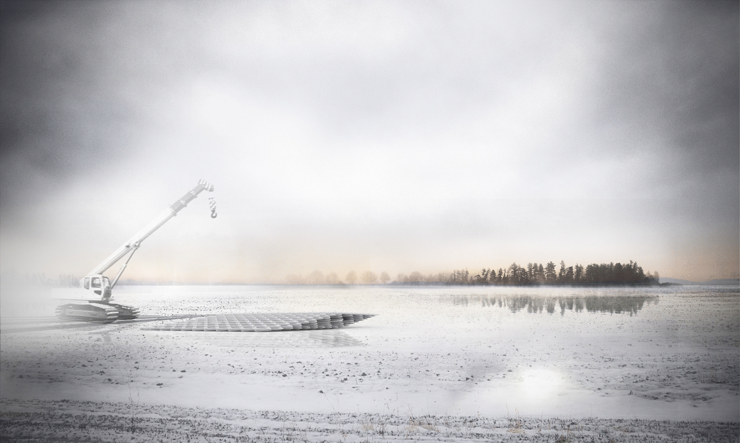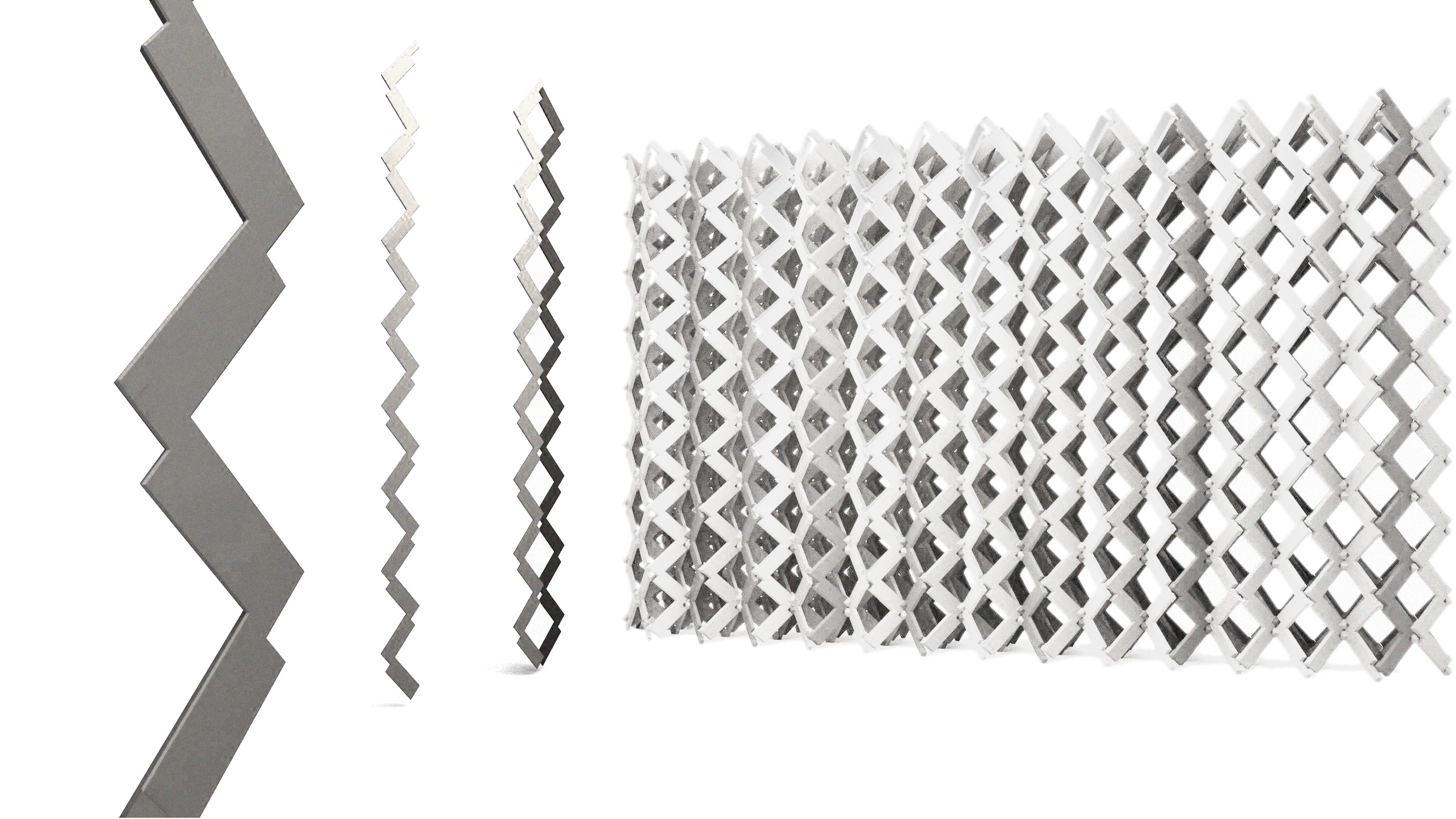 The squared square geometry of Volume ranges in applications from products and installations to architectural structures, with each sculpture assigned a numeric identifier: (number of pieces)-(number of layers)-(height of each piece)-(number of vertical pieces)-(gauge number). This incarnation, 220-20-24-18-5, is a 36’ x 36’ x 36’ installation that functions as a popup pavilion. It is lifted into place with one sweeping motion of a crane, turning the installation into a performance.