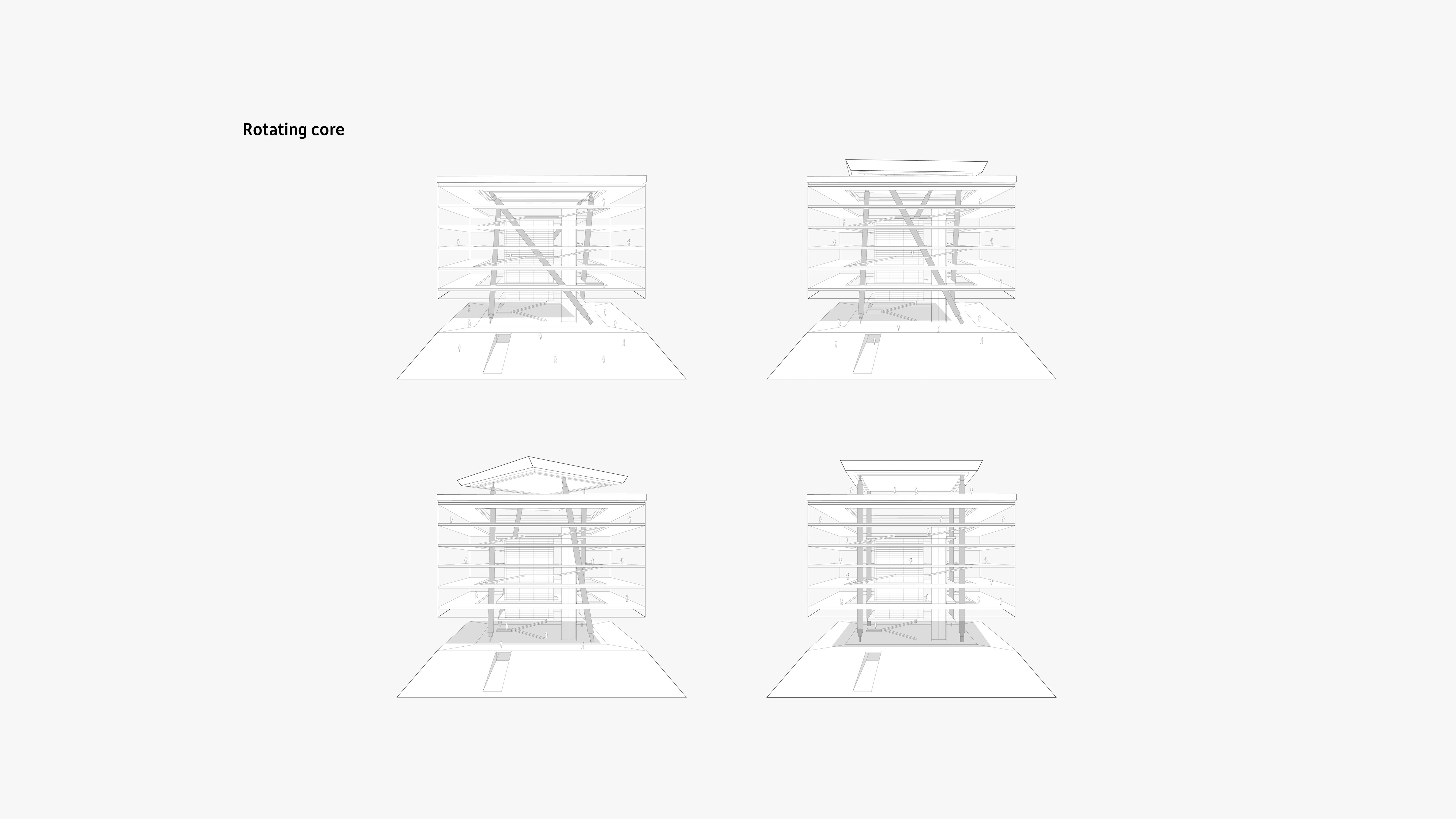 The Twist Library separates structure into tension and compression. Unlocked, it springs into a lighter, taller, and airier structure. With all essential library functions packaged into a central core, the exterior nesting spaces are flexible to transformations in program, layout and expectation.